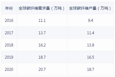 图表:2016-2020年全球碳纤维需求量及产量(单位:万吨)