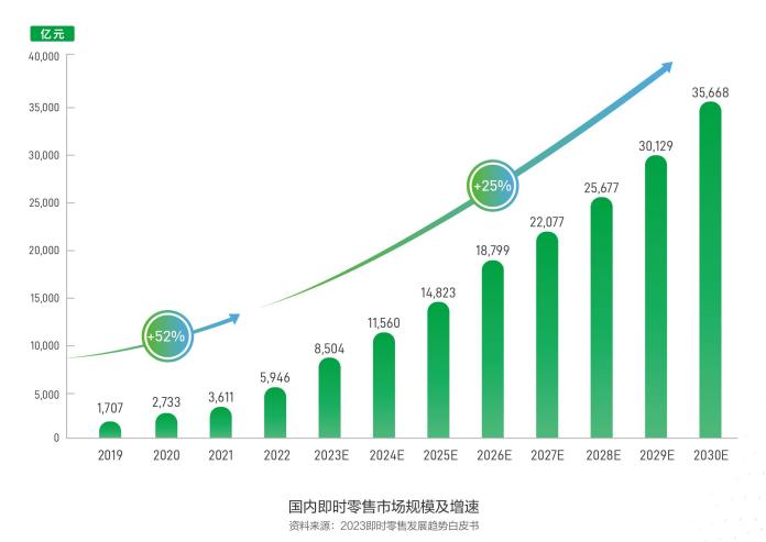随着消费习惯的养成与商品品类的线上化突破,预计2022- 2025年,即时零售市场规模增速为36%,在2025年将达到约1.5万亿元,预计到2030年,即时零售市场规模有望增长到约3.6万亿元。