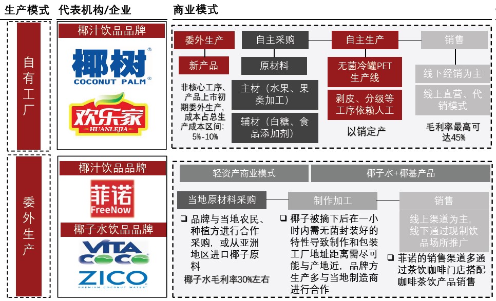 据中研普华产业研究院发布的《2023-2028年中国椰汁市场深度调查研究报告》显示:椰子汁中游企业主要分为两种生产模式,分别为通过自有工厂生产以及委外生产。以老牌传统椰汁企业椰树、欢乐家来说,产品毛利率最高可达45%,其核心产品为自主生产,非核心产品通过委外模式生产。椰子水毛利率区间在30%左右,而销售单价多高于椰汁饮品。椰子水品牌多为轻资产商业模式,连接工厂和渠道两端。椰子水在生产过程中需要在椰子被摘下后的一小时内无菌封装,此特性要求工厂地址的距离需尽可能与椰子产地近。所以椰子汁品牌在发展初期多与当地工厂进行合作。因此椰子水品牌在中游运营效率、议价能力较弱,毛利率较低。