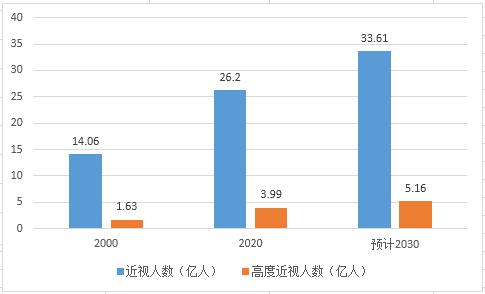 根据世界卫生组织发布的《World Report on Vision》显示,2000 至 2020年全球近视人数从 14.06 亿人增长至 26.20 亿人,年均复合增长率为 3.16%;其中,高度近视人数从 1.63 亿人增加至 3.99 亿人,年均复合增长率为 4.58%。预计到 2030 年,近视人数、高度近视人数将分别达到 33.61 亿人和 5.16 亿人。因此,在视光矫正需求下,眼镜逐渐成为人们必不可少的生活工具。