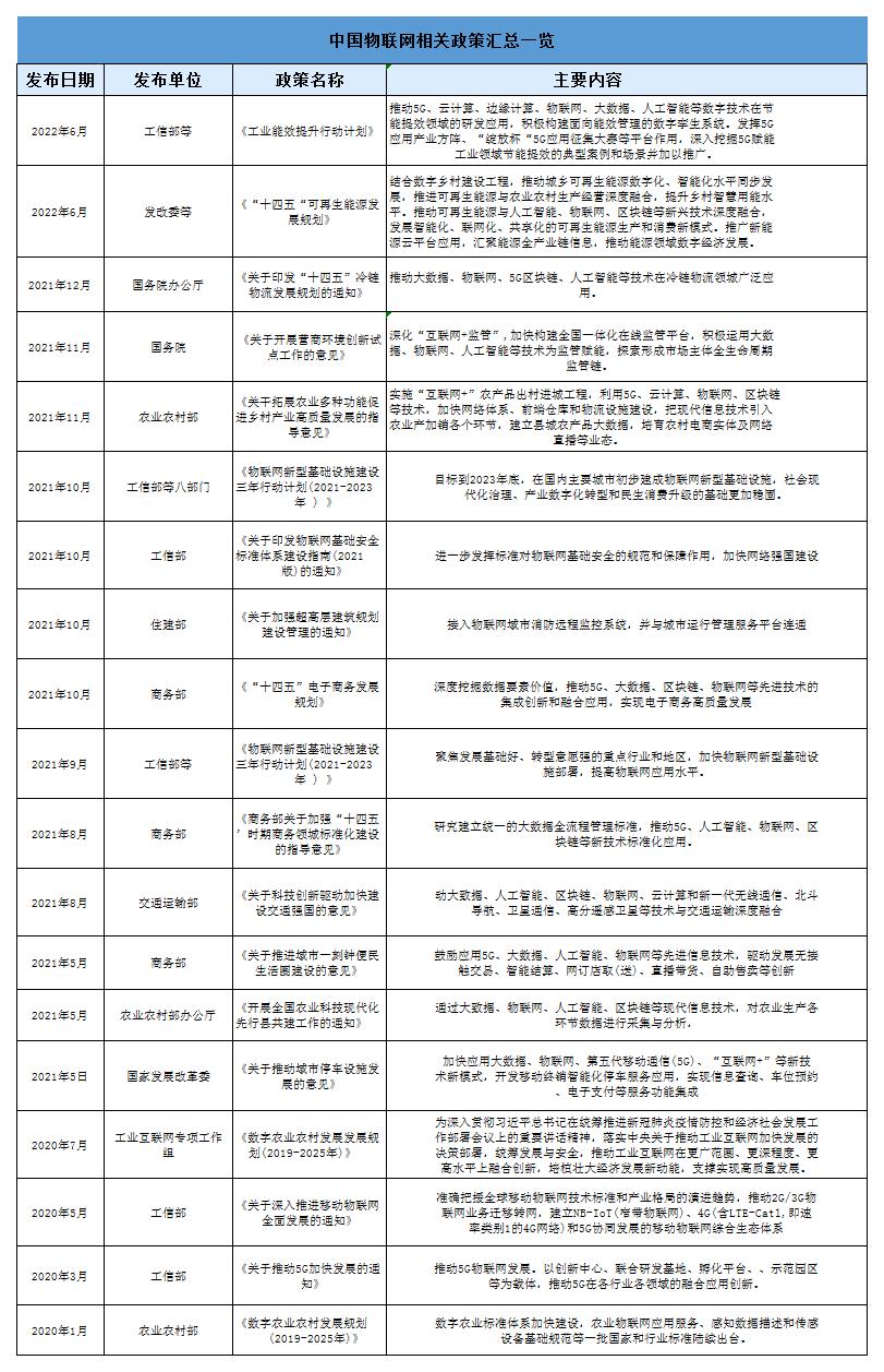 建设物联网新型基础设施并发挥标准的规范和保障作用:工信部在2021年10月发布的《关于印发物联网基础安全标准体系建设指南(2021版)的通知》中,进一步发挥标准对物联网基础安全的规范和保障作用,并计划在2023年底在国内主要城市初步建成物联网新型基础设施。