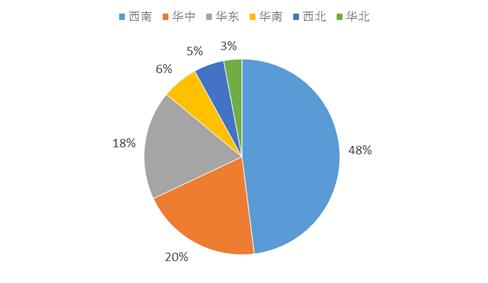 由于磷酸铁锂主要用于新能源汽车的锂离子电池正极材料,因此行业受新能源汽车产业影响较大。过去关于新能源汽车的补贴政策以动力电池能量密度、续航里程等技术指标作为发放补贴的依据,而磷酸铁锂电池的能量密度相对三元电池较低,因此电池企业在政策推动下主要选择三元材料路线,因此行业整体规模相对较小。而后续新的补贴政策淡化了能量密度和续航指标,2021年以来新能源汽车产销量爆发式增长,加上我国动力电池头部企业宁德时代、比亚迪等均加强对封装形式的技术迭代,特别是CTP技术、刀片电池技术的落地和应用,使得磷酸铁锂电池能量密度大幅提升,叠加在成本、安全性等方面的良好表现,磷酸铁锂迎来快速发展。西南、华中和华东地区是我国磷酸铁锂产能占比最大的区域,占比分别为48%、20%和20%左右。