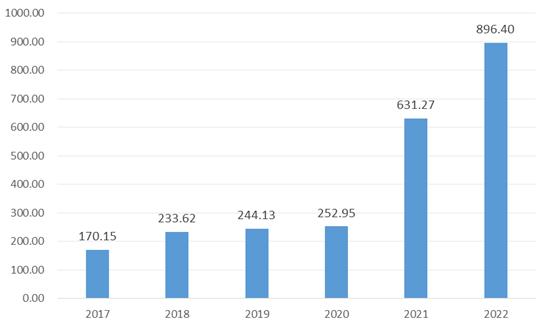 图表:2020-2022年中国磷酸铁锂正极材料行业供应规模(单位:亿元)