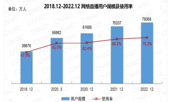 数字技术深刻改变着文化产品的生产方式和传播格局,借助直播、短视频,不同的文化消费资源和要素得以流动、重组。截至2022年12月,我国网络直播用户规模达7.51亿,较2021年12月增长4728万,占网民整体的70.3%。其中,电商直播用户规模为5.15亿,较2021年12月增长5105万,占网民整体的48.2%;游戏直播的用户规模为2.66亿,较2021年12月减少3576万,占网民整体的24.9%;真人秀直播的用户规模为1.87亿,较2021年12月减少699万,占网民整体的17.5%;演唱会直播的用户规模为2.07亿,较2021年12月增长6491万,占网民整体的19.4%;体育直播的用户规模为3.73亿,较2021年12月增长8955万,占网民整体的35.0%。