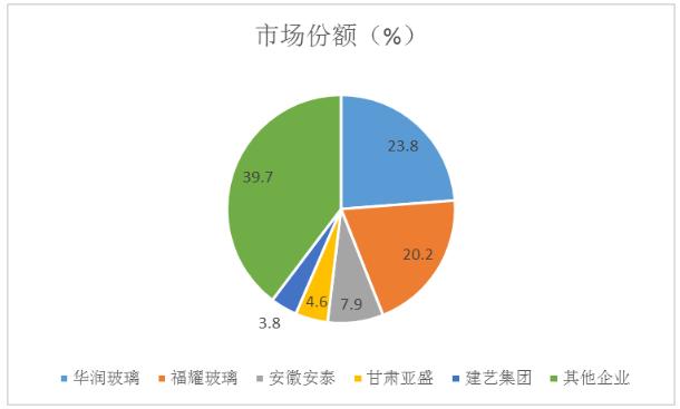 我国平板玻璃市场份额前五家企业分别为华润玻璃、福耀玻璃、安徽安泰、甘肃亚盛、建艺集团,市场份额分别为23.8%、20.2%、7.9%、4.6%和3.8%左右。