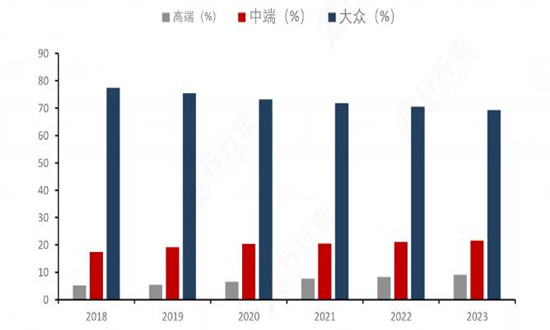 中高端男装逐步扩大市场份额。虽然大众男装在市场中仍占有较大份额,但在男装市场规模大幅变动的情况下,中高端男装的市场占有率依旧呈现出逐年增加的趋势。