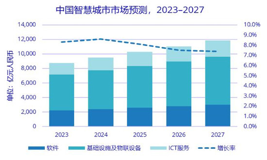IDC 预计,到2027 年,中国智慧城市ICT 市场投资规模将达到11858.7 亿元人民币,2023–2027 年的年均复合增长率(CAGR)为8.0%。