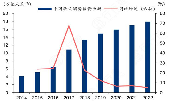 图表:中国狭义消费信贷余额及增速