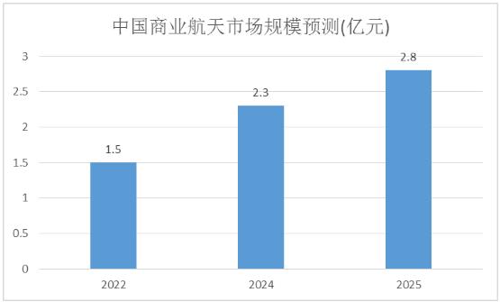 2022年中国商业航天的市场规模突破1.5万亿元,预计2024年将突破2.3万亿元,2025年市场规模将达2.8万亿元。