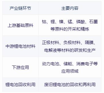 锂电池产业链可以细分为上游基础原料、中游锂电池材料和锂电池模组、下游应用和锂电池回收利用等部分。其中,上游基础原料主要包括钴、锂、镍、锰、磷酸、石墨等,这些原料的开采和精炼是锂电池制造的起点。中游锂电池材料主要有正极材料、负极材料、隔膜、电解液等,这些材料的研发和生产是锂电池制造的关键环节。下游应用领域主要包括动力电池、储能、消费电子等,随着新能源汽车和储能市场的不断扩大,锂电池的应用前景非常广阔。