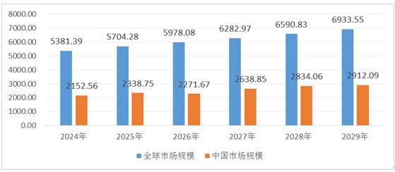 图表:2024-2029年全球及中国防抱死系统上游行业发展预测(单位:亿元)