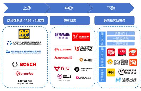 中游整车装备:ABS系统通过B2B渠道进入装备市场。主要包括电动自行车如雅迪、爱玛、绿源和新日等几大传统电动自行车制造商以及小牛等新兴企业;电动摩托车这几早上、以及传统燃油摩托制造商。