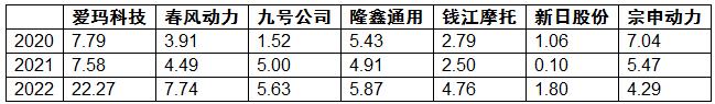 根据企业财报信息,我国电动摩托车行业几家头部企业的营业收入如下表所示: