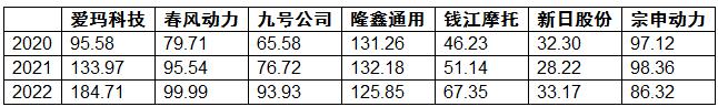 图表:2020-2022年我国电动摩托车企业营业收入对比(单位:亿元)