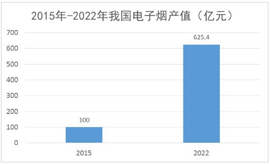据中研普华产业院研究报告《2024-2029年电子烟产业现状及未来发展趋势分析报告》数据显示,2022年我国电子烟产值达到625.4亿元,同比增长8.1%,2015年到2022年复合增长率接近29.41%,保持着较高的增长速度。