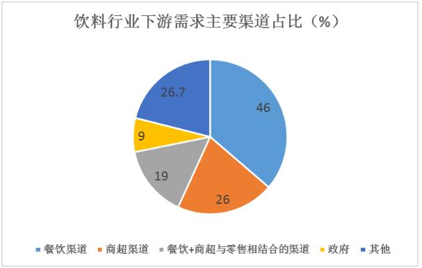 据中研普华产业院研究报告《2024-2029年中国饮料行业深度发展研究与“十四五”企业投资战略规划报告》分析:饮料行业下游需求主要包括餐饮行业、学校以及商超渠道三部分。其中餐饮渠道占比最高,达46%;商超渠道次之,占比26%;餐饮+商超与零售相结合的渠道占比19%。