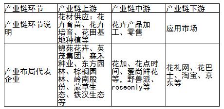 从产业布局来看,在上游领域,花材供应代表企业有锦苑花卉、英茂集团、森禾种业、东方园林、棕榈园林、岭南股份、蒙草生态、铁汉生态等。