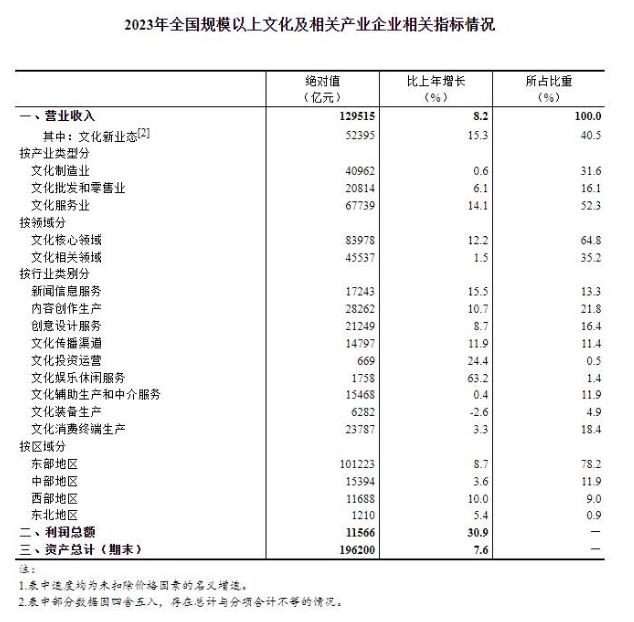据国家统计局网站消息,据对全国7.3万家规模以上文化及相关产业企业(以下简称“文化企业”)调查,2023年,文化企业实现营业收入129515亿元,按可比口径计算,比上年增长8.2%。其中,文化新业态特征较为明显的16个行业小类实现营业收入52395亿元,比上年增长15.3%,7