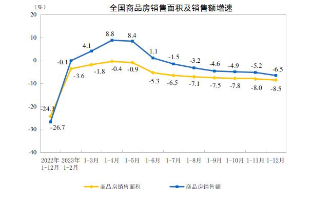 据国家统计局数据显示,2023年,全国房地产开发投资约11.09万亿元,同比下降9.6%;全国商品房销售面积约11.17亿平方米,同比下降8.5%,创2012年以来新低;全国商品房销售额约11.66万亿元,同比下降6.5%,销售额创2016年以来新低。