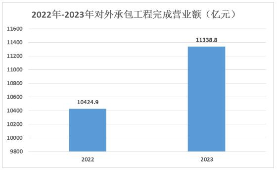 2023年,我国对外承包工程业务完成营业额11338.8亿元人民币,比上年(下同)增长8.8%(以美元计为1609.1亿美元, 增长3.8%),新签合同额18639.2亿元人民币,增长9.5%(以美元计为2645.1亿美元, 增长4.5%)。