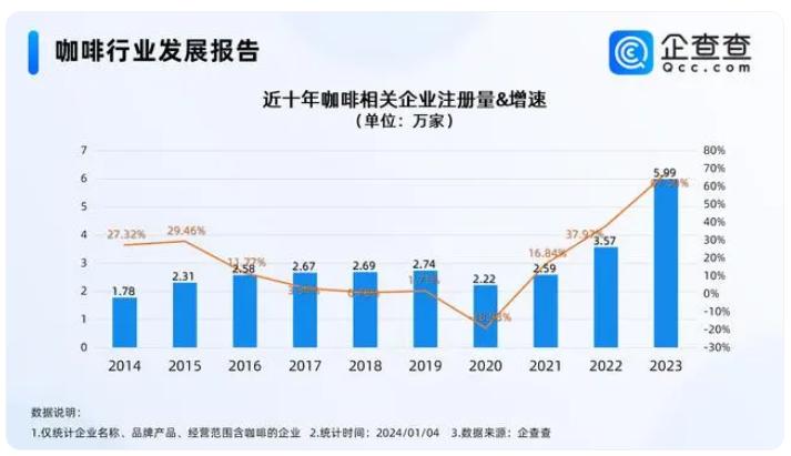 企查查数据显示,我国现存咖啡相关企业21.34万家。近十年,我国咖啡相关企业注册量呈整体高速增长态势。我国咖啡相关企业于2021年起,呈现逐年高速增长态势,2021年、2022年、2023年,我国咖啡相关企业注册量分别为2.59万家、3.57万家、5.99万家,同比增长16.84%、37.97%、67.50%。从区域来看,广东现存3.7万家咖啡相关企业,位居第一。云南、江苏分别现存2.4万家、1.46万家咖啡相关企业。此后是浙江、四川、山东等地。