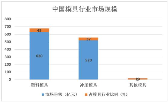 目前,中国的模具行业已经成为世界模具制造大国和模具贸易大国。据统计,75%的粗加工工业产品零件、50%的精加工零件都需要由模具成型,而绝大部分塑料制品也由模具成型。塑料模具和冲压模具是主要的模具品种,市场规模分别达到了630亿和520亿,分别占模具行业的45%和37%。