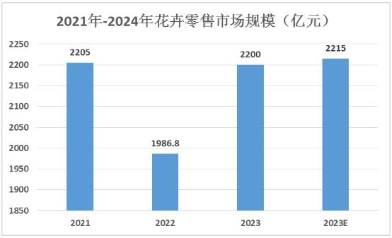 根据最新的数据,2021年,我国花卉零售市场规模达2205亿元,比2020年增长17.5%。2022年,我国花卉零售市场总规模达到了1986.8亿元。其中,实体花店零售规模达到了900亿元,预计2023年我国花卉零售市场规模约为2200亿元。而鲜花电商的规模则达到了1086.8亿元。这一数据显示了中国花卉市场的重要性和影响力。