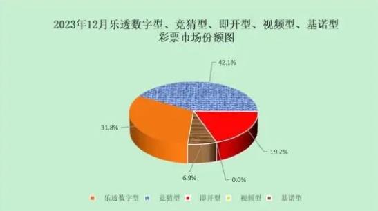 12月份,乐透数字型彩票销售169.52亿元,同比增长29.3%;竞猜型彩票销售224.31亿元,同比下降47.8%;即开型彩票销售102.24亿元,同比增长214.4%;基诺型彩票销售36.76亿元,同比增长47.3%。12月份,乐透数字型、竞猜型、即开型、基诺型彩票销售量分别占彩票销售总量的31.8%、42.1%、19.2%、6.9%,视频型彩票销售14万元,同比增加12万元。