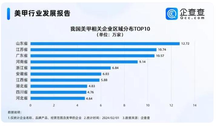 从区域来看,山东现存12.72万家美甲相关企业,位居第一。江苏、广东分别现存10.74万家、10.57万家美甲相关企业,分列二三位。此后是河南、浙江、安徽等地。