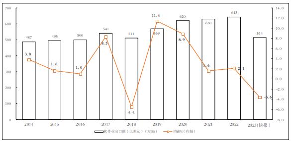 2023年,我国软件和信息技术服务业运行稳步向好,软件业务收入高速增长,盈利能力保持稳定,软件业务出口小幅回落。2023年,软件业务出口514.2亿美元,同比下降3.6%。其中,软件外包服务出口同比增长5.4%。