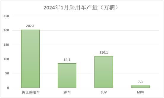 2024年1月全国狭义乘用车产量为202.1万辆,同比提升50%,环比下滑24.5%。其中轿车产量为84.8万辆,同比上升40.8%;SUV产量为110.1万辆,同比上升60.2%;MPV产量为7.3万辆,同比提升23.9%。