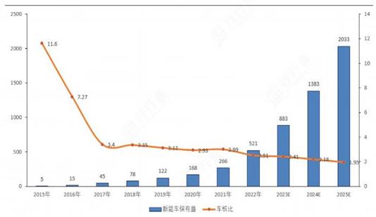 在新能源车销量稳定增长、政策支持、与投资商积极参与的背景下,预计2024年-2025年充电桩仍有望保持较快增长,车桩比将延续趋势性下降态势,2024年、2025年分别有望降至2.18、1.95。
