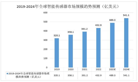 全球智能传感器市场规模持续扩大。2022年全球智能传感器市场规模达到432.9亿美元,2019-2022年的年均复合增长率为10.59%。据分析师预测,2023年全球智能传感器市场规模将达到489.3亿美元,2024年将达541.1亿美元。