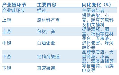 就白酒行业产业链情况而言,我国白酒行业上游主要包括原材料产商与包材厂商,其中原材料产商主要向酒企提供高粱、小麦、豌豆等原料及相关辅料,包材厂商主要提供酒瓶、酒盖、纸箱等;白酒产业链的中游系以茅台、五粮液、泸州老窖和洋河股份等为代表的白酒企业,下游最终产品通过经销商渠道与直营渠道流向终端消费市场,按照线上线上又可分为线下品牌专卖店、大型商超、小卖部、酒类店铺、零售电商、品牌电商等。