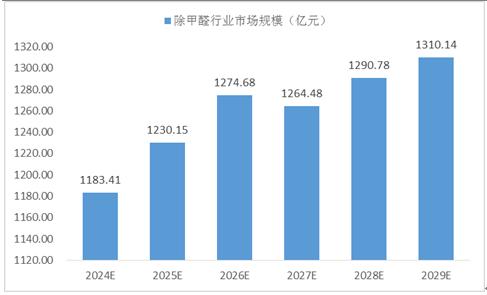 总体来看,未来几年,我国除甲醛将稳定在千亿市场规模,预测2024年我国除甲醛行业市场规模达到1183.41亿元,至2029年,除甲醛行业市场规模达到1310.14亿元。
