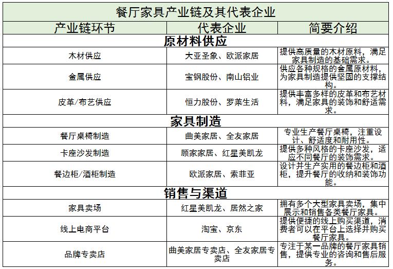 餐厅家具行业的上中下游主要涉及到原材料供应、家具制造以及销售与渠道等环节。