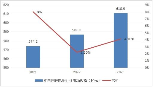 根据Research and Markets相关数据显示,2021-2023年我国同轴电缆行业市场规模如下图所示,截至2023年底,行业市场规模达610.9亿元。