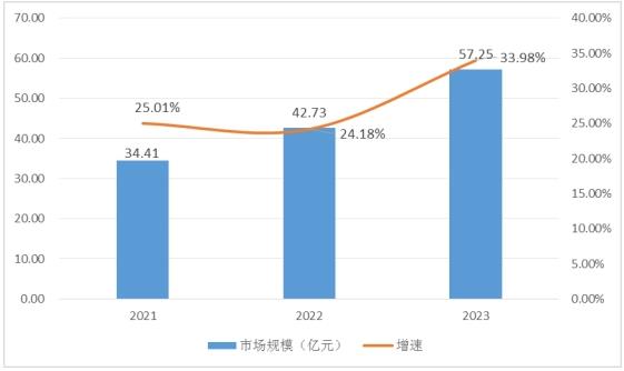 随着电力和通信需求的不断增长,漏泄电缆市场得到了快速发展。由于漏泄电缆在信号传输和天线功能方面的优势,其应用领域日益扩大,包括移动通信覆盖、隧道通信、周界安防等。这些需求的增长直接推动了漏泄电缆市场规模的扩大,其中铁塔、三大通信运营商作为最大买家,2021年国内漏泄电缆市场规模约为34.41亿元,2021年至2023年,年均增长稳定在28%左右,2023年市场规模来到57.25亿人民币。