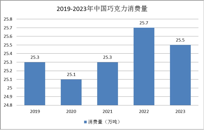从国内市场来看,巧克力已经不是一种简单的食品,而是相爱的人们相互表情达意的凭证,是节日馈赠亲朋好友得体而深受欢迎的精美礼品,更是人们放松心情,补充能量的营养休闲食品,2023年中国巧克力消费量达25.5万吨。