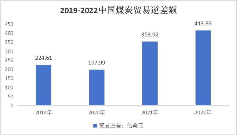 中国煤炭行业贸易逆差呈现扩大趋势。中国煤炭行业主要以进口为主,2022年,中国煤炭进口量达到29320万吨,出口量为400万吨,且中国煤炭行业进出口贸易逆差整体呈扩大趋势,2022年中国煤炭行业贸易逆差规模扩大至413.83亿美元。