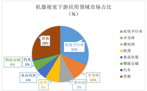 机器视觉下游应用领域多样,目前主要用于电子与半导体、汽车、锂电池、食品包装等。目前,3C电子行业市场份额最高,占比为31.6%。其次分别为半导体、锂电池、医药、食品包装、物流仓储、汽车,占比分别为10.2%、8.9%、8.1%、6.3%、5.8%、1.0%。