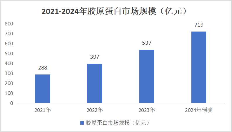 2021年,我国胶原蛋白产品市场规模达到了288亿元,同比增长高达40.5%。而到了2022年,这一市场规模已跃升至约397亿元,继续保持了强劲的增长势头。据预测,到了2023年,胶原蛋白市场规模将达到537亿元,而在2024年,更是预计将达到719亿元。