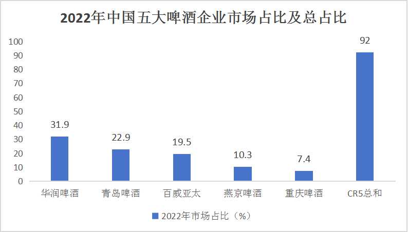 华润啤酒、青岛啤酒、百威亚太、燕京啤酒和重庆啤酒为啤酒市场的前五企业,在2022年的市场占比分别为31.9%、22.9%、19.5%、10.3%和7.4%,总和CR5达到92%。
