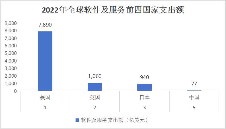 据中研产业研究院发布的《2024-2029年中国软件行业市场现状分析及发展趋势预测研究报告》收集的统计数据显示,从软件及服务支出排名来看,2022年,美国软件及服务支出额约为7890亿美元,遥遥领先;其次为英国,支出额1060亿美元;再次为日本,支出额940亿美元,中国的软件及服务支出费用为77亿美元,排名第五。以上数据说明我国的软件行业还有很大的发展潜力。