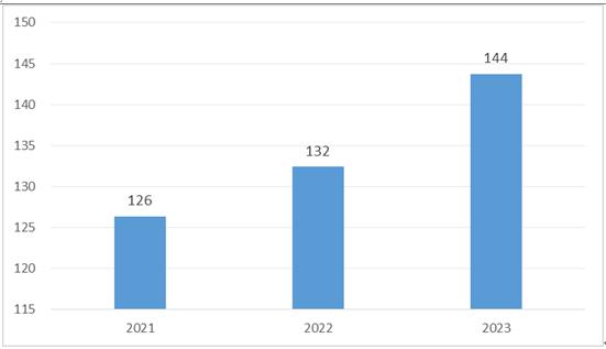 图表:2021-2023年全球卫星制造业发展规模(亿美元)