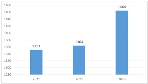 图表:2021-2023年全球卫星服务业发展规模(亿美元)