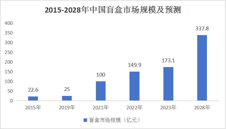 据预测,中国盲盒行业至少还会迎来6年的高增长期,预计2028年盲盒行业市场规模将翻倍,达337.8亿元。