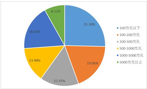根据注册情况,注册资本在100万元以下的企业数量占比最大,达到25.38%;其次为100-200(不含)万元规模的企业数量占比达到19.06%;200-500(不含)万元注册规模的企业所占份额为15.43%;500-1000(不含)万元注册规模的企业所占份额为13.98%; 1000-5000(不含)万元注册规模的企业所占份额为18.03%;5000万元注册规模以上的企业所占份额为8.12%。
