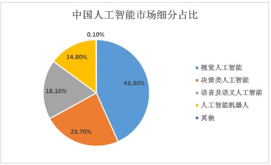 按照应用领域,我国人工智能可分为决策类人工智能、视觉人工智能、语音及语义人工智能和人工智能机器人。其中,视觉人工智能市场占比最高,达43.3%;决策类人工智能、语音及语义人工智能、人工智能机器人,占比分别为23.7%、18.1%、14.8%。