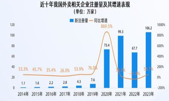 企查查数据显示,近十年,我国外卖行业发展显著,相关企业注册量在2020年开始爆发式增加,注册量连续四年保持在67万家至110万家之间,2023年全年,我国外卖相关企业注册量同比增加56.7%至106.2万家。